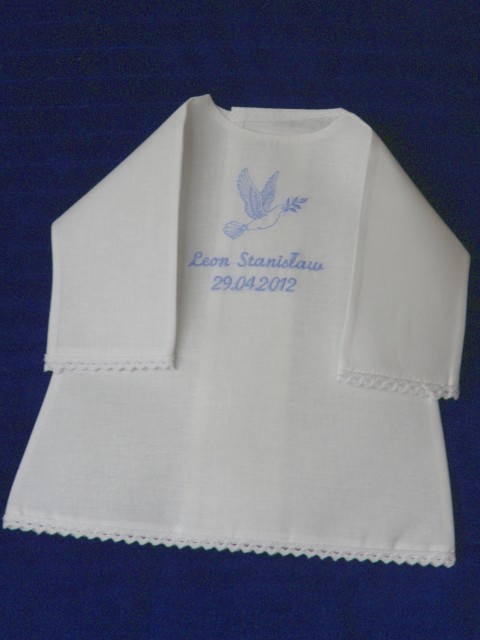 Poza standardowym gołąbkiem, na szatce haftowane są IMIONA dziecka i data chrztu.