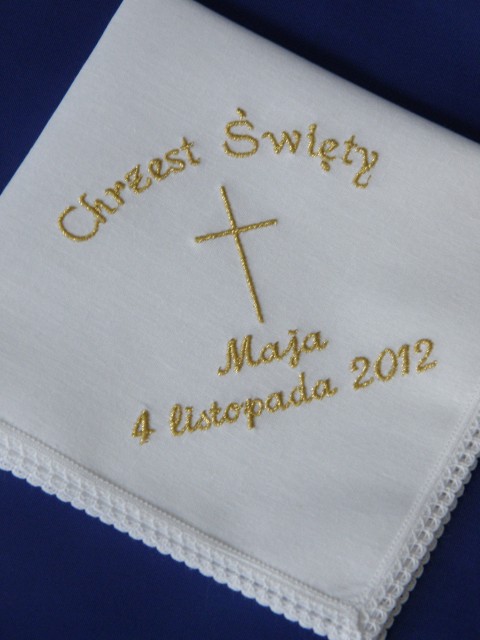 Poza standardowym wzorem:krzyżyk i napis "Chrzest Święty", na szatce mogą zostać wyhaftowane imiona dziecka i data chrztu.