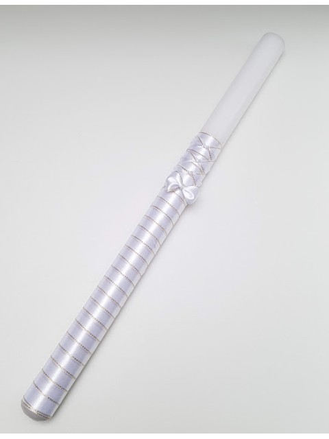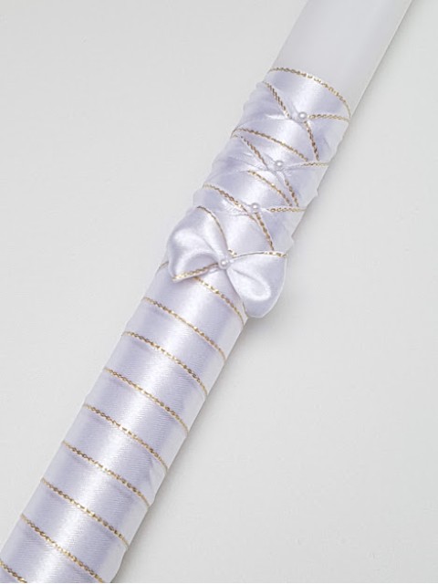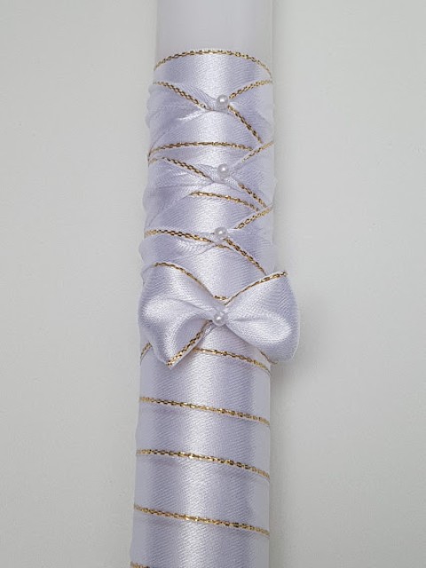 Elegancka Świeca do Chrztu lub Komuni Świętej, ręcznie zdobiona atłasową wstążką ze złotym brzegiem.