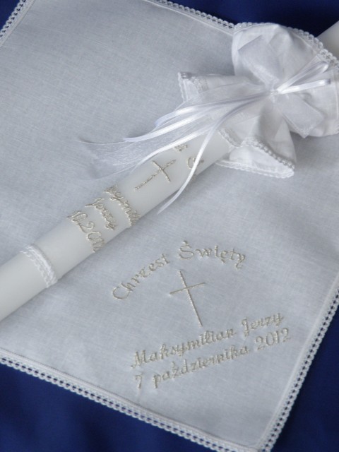 Świeca Chrztu: Dołączona świeca, również spersonalizowana, nie tylko reprezentuje światło wiary w życiu Twojego dziecka, ale jest również ręcznie wykonana, co zapewnia jej unikalność i wartość symboliczną.