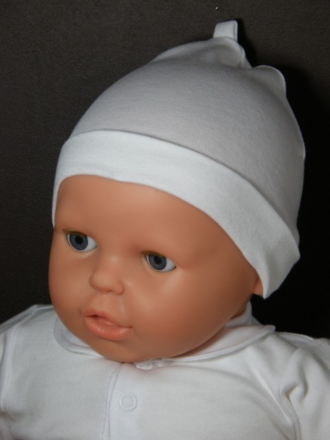 Biała, gładka czapeczka niemowlęca z dzianiny bawełnianej znanej i cenionej firmy SOFIJA . Prosta i klasyczna czapeczka niemowlęca, pasująca do ubranka w każdym stylu, ze względu na brak zdobień. Sposób wykonania czapeczki gwarantuje, że nie będzie ona spadać z główki dziecka.