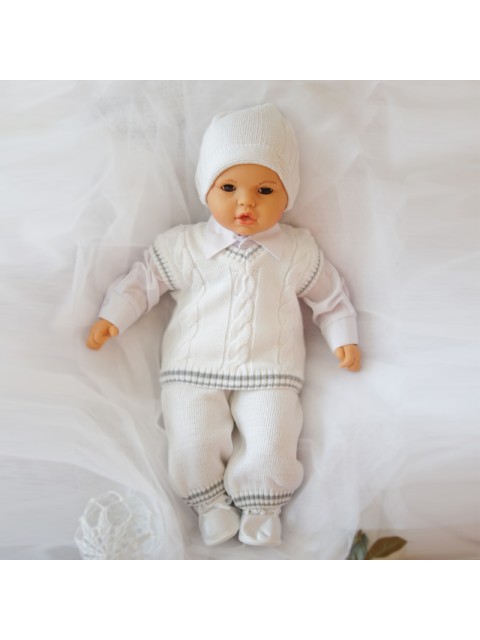 Elegancka KAMIZELKA dla chłopca w kolorze białym z popielatym wykończeniem brzegów.