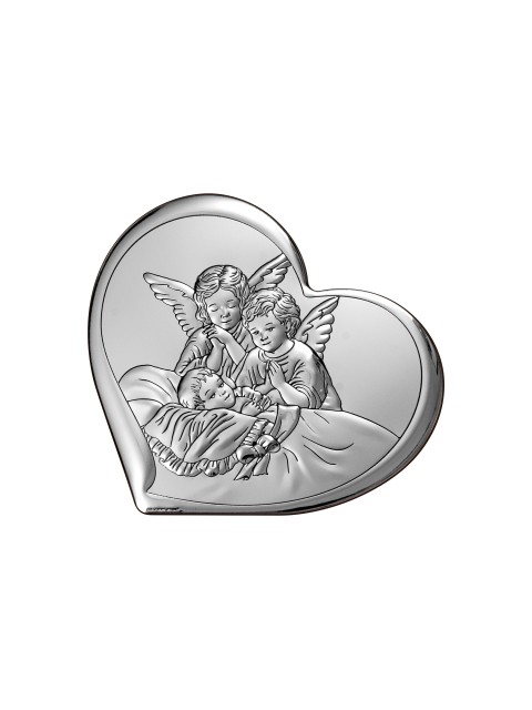 Srebrny obrazek w kształcie serduszka na drewienku z Aniołami przy śpiącym dziecku- włoskiej produkcji BELTRAMI.