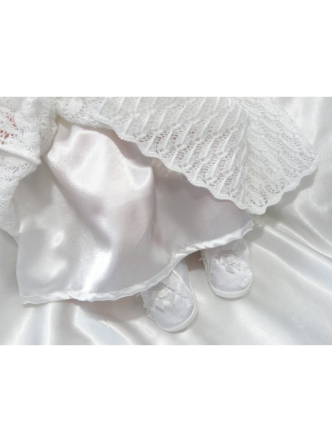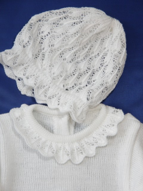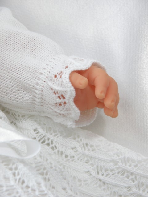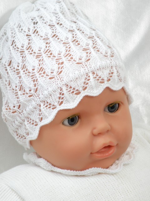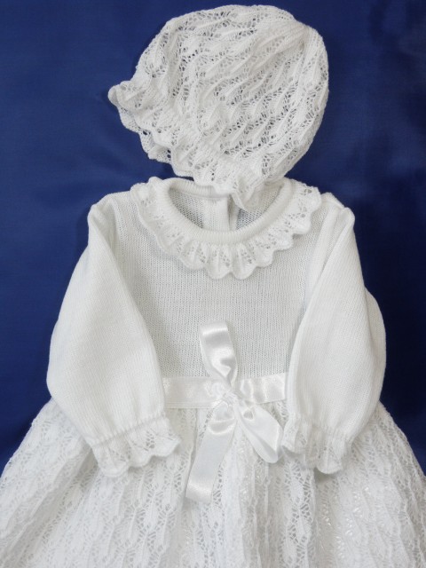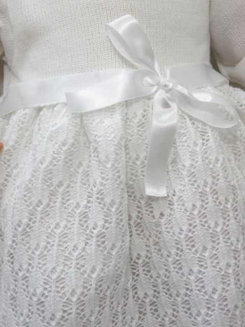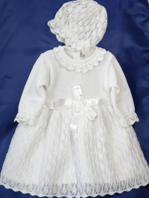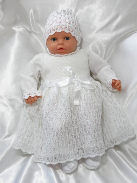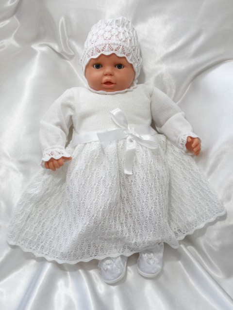 Biała, ażurowa sukienka do Chrztu z długim rękawem i czapeczką. Wykonane z mięciutkiej dzianiny bawe..