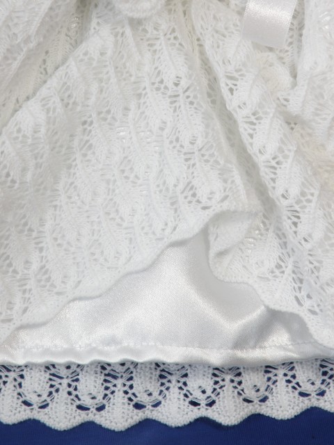 Sukienka jest z tyłu zapinana na guziczki, ma eleganckie ażurowe wykończenie: kołnierzyk, mankiety i dół sukienki. Góra jest gładka i kontrastując z pozostałą częścią sukienki i czapeczką sprawia, że całość nie jest nudna.